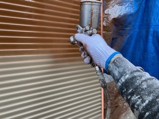 この日は外壁以外にも付帯部の塗装工事も進め、雨戸の吹付塗装など行いました。