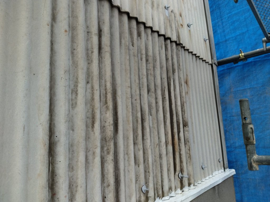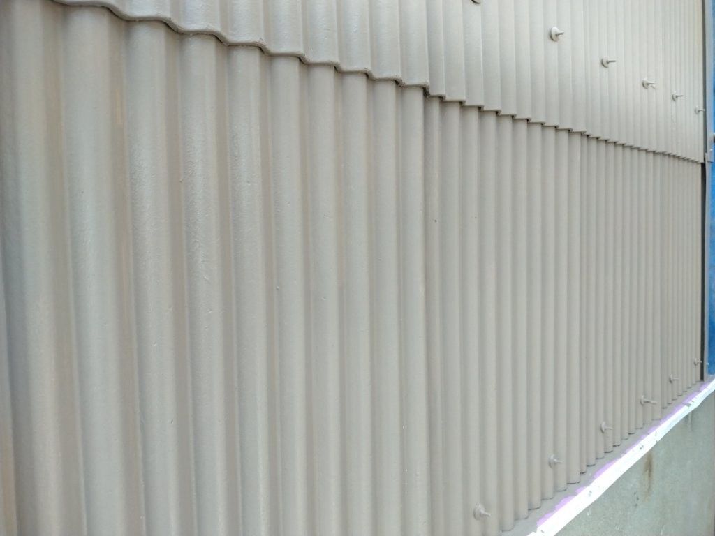 こちらの工場では、長年の風雨や粉塵によって波型スレート外壁の汚れや色あせが進行していました。