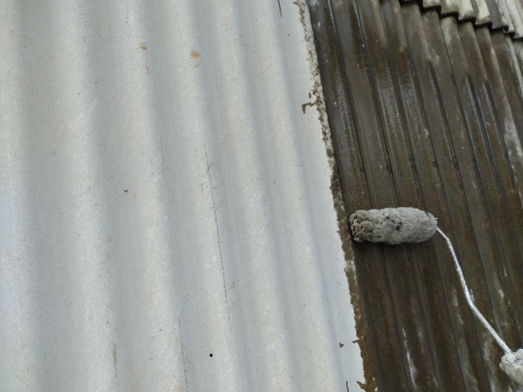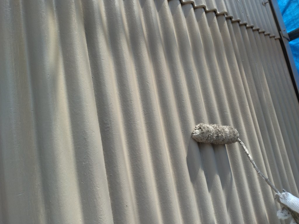 高圧洗浄後、下地の吸い込みを抑え塗料の密着を高めるため、下塗り材をたっぷりと塗布しました。波型形状のためローラーをしっかり押し当て、塗り残しのないよう丁寧に作業しています。