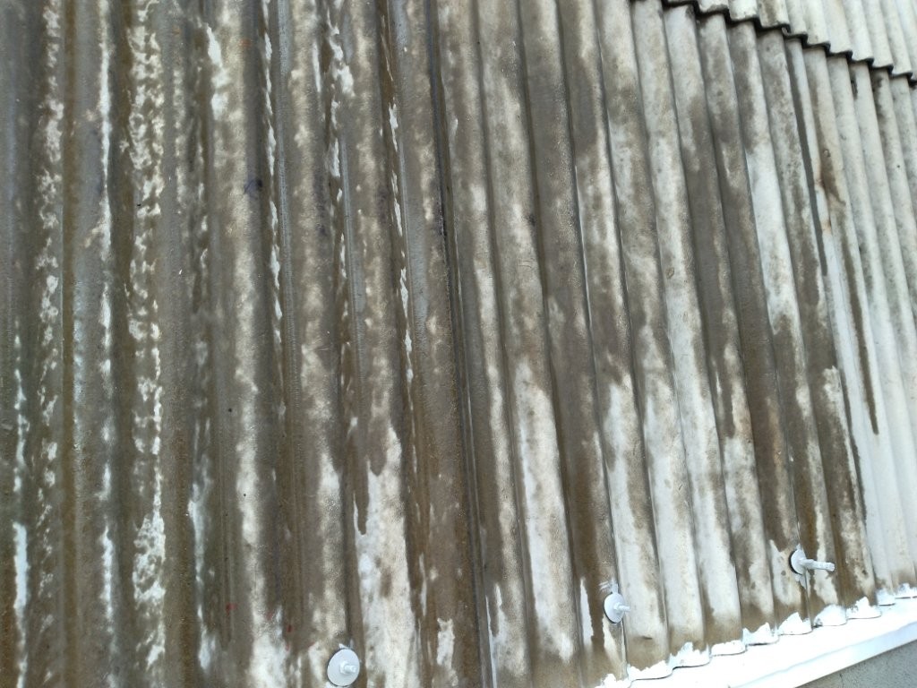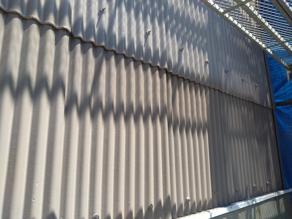 波型スレート全体に黒ずみ・汚れが広がり、部分的には粉化(チョーキング)や細かなひび割れも見られました。防水性能の低下が懸念されるため、塗膜による保護が必要でした。
